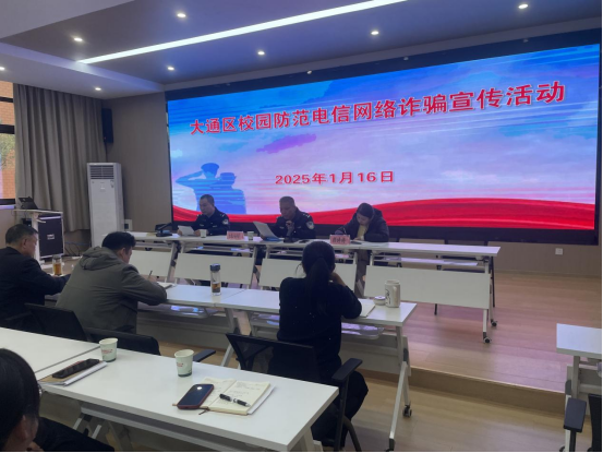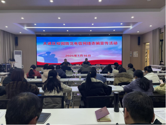 2025年1月16日下午,大通区教体局联合大通区公安分局在淮师附小大通校区D楼报告厅召开了大通区校园防范电信网络诈骗宣传活动。区教体局局长李海燕,区教体局副局长颜婷婷,区教体局党委委员、淮师附小大通校区校长陈再胜,区公安分局治安大队大队长胡继成,区公安分局刑侦大队民警谢宇,区教体局安全工作负责人张金全,区属中小学、幼儿园主要负责人、骨干教师等50余人参加活动。