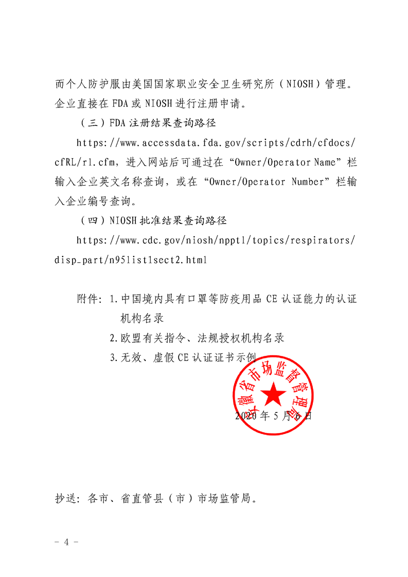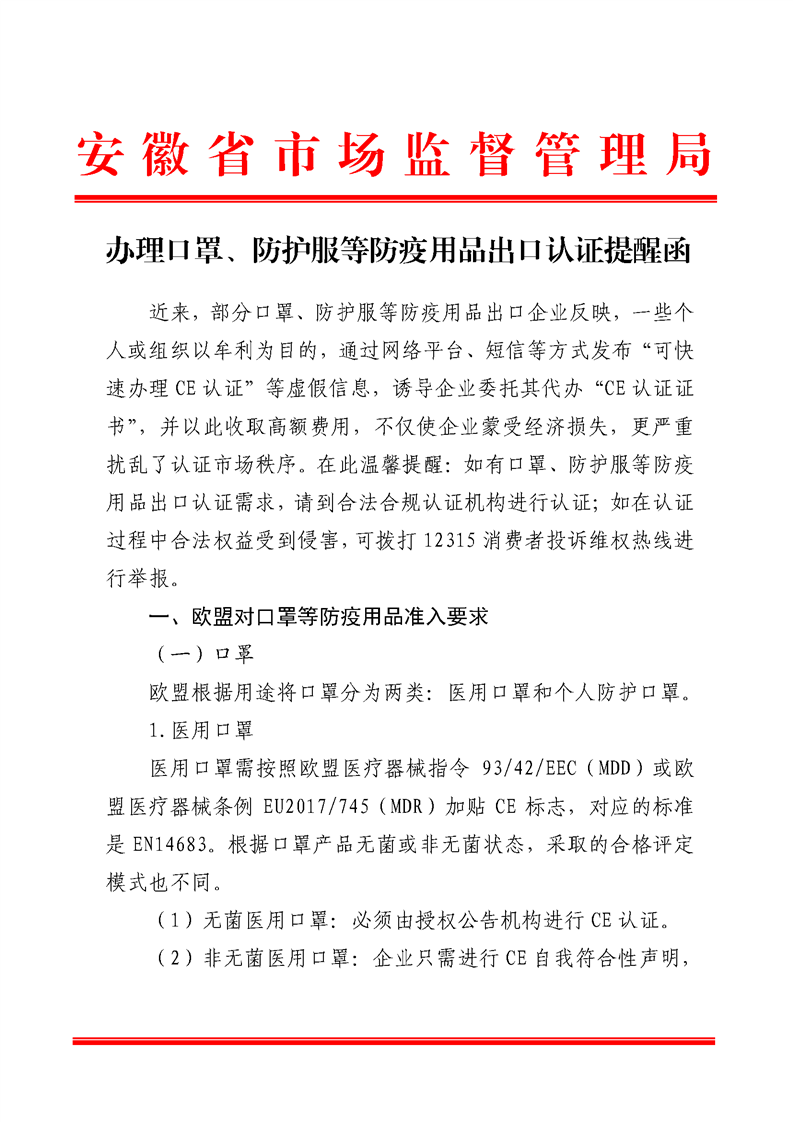安徽省市场监管局《办理口罩、防护服等防疫用品出口认证提醒函》