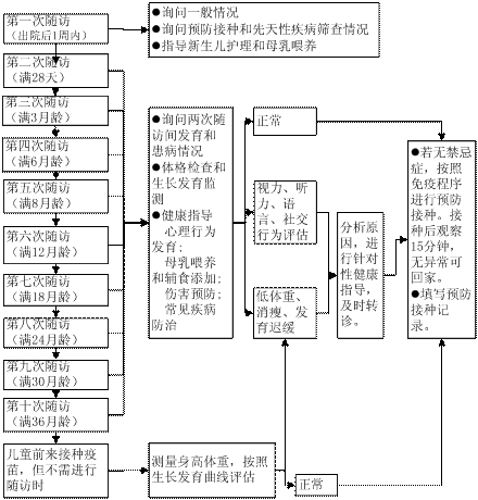 满月后的随访服务均应在乡镇卫生院、社区卫生服务中心进行,偏远地区可在村卫生室、社区卫生服务站进行,时间分别在3、6、8、12、18、24、30、36月龄时,共8次。有条件的地区,建议结合儿童预防接种时间增加随访次数。