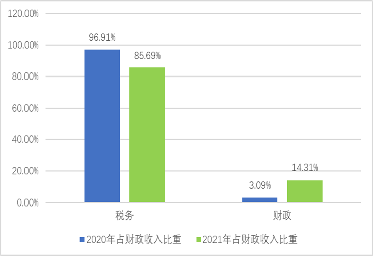 分性质看:2021年税收收入(财政口径含上划中央税收)完成62988万元,占财政总收入的85.69%,完成年调整预算的101.47%,同比增长14.79%,非税收收入完成10523万元,占财政总收入的14.31%,完成年调整预算的239.15%,同比增长446.65%。