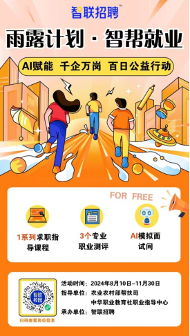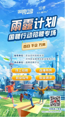 为进一步巩固拓展脱贫攻坚成果、全面推进乡村振兴,扎实推进“雨露计划+”就业促进行动,帮助“雨露计划”毕业生实现更充分、更高质量的就业,农业农村部帮扶司联合中华职业教育社职业指导中心,协调指导国投人力资源服务有限公司和北京智联三珂人才服务有限公司分别开展“雨露计划”就业帮扶公益行动,组织“百日、千企、万岗”集中双选,为“雨露计划”毕业生精准匹配推送就业信息,提供就业培训指导,活动持续到11月底。