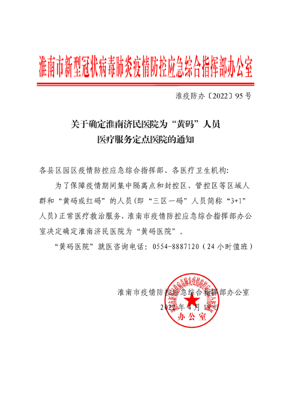 关于确定淮南济民医院为“黄码”人员医疗服务定点医院的通知