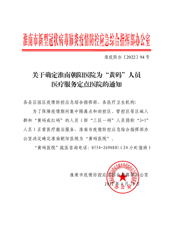 | 名称: | 关于确定淮南朝阳医院为“黄码”人员医疗服务定点医院的通知 |