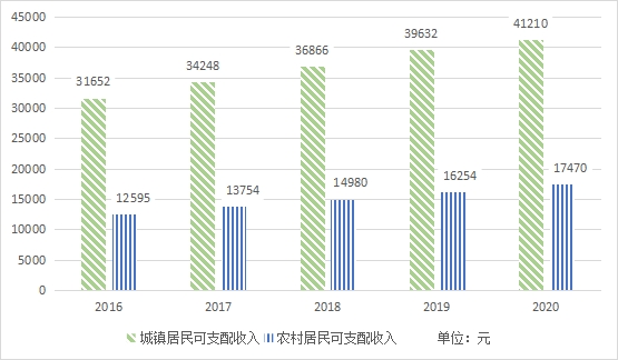 图2 2016—2020年大通区城镇/农村居民可支配收入