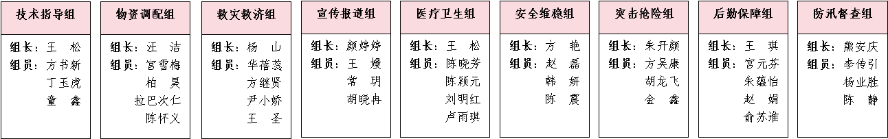 为进一步做好防汛抗旱其它具体工作,特成立九个小组,其成员安排如下: