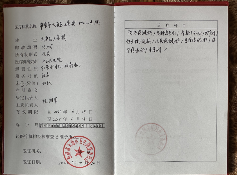 1、医院情况:城乡居民定点,床位30张,法人代表:汪海军 2、医疗机构执业许可证号:PDY00001X-34040211C2101 3、2009年成立。诊疗科目:预防保健科、全科医疗科、内科、外科、妇产科、妇女保健科、儿童保健科、医学检验科、医学影像科、口腔科、中医科(超声波药物透入治疗、针灸、拔罐、刮痧、理疗等) 4.统一社会信用代码:1234****341291H