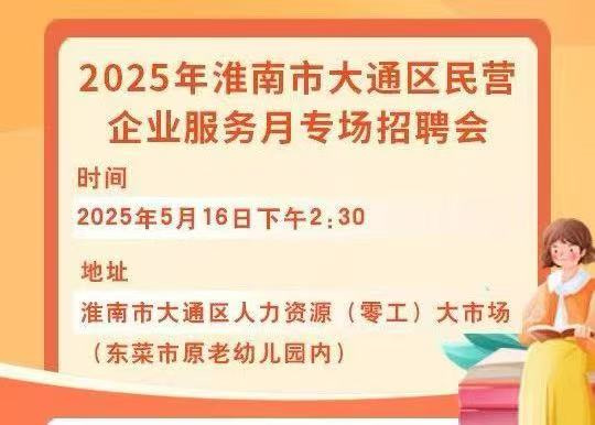 为进一步做好就业创业服务工作,助力本区民营企业解决用工问题,促进求职者实现充分高质量就业,帮助居民就近就业,助推经济社会发展,大通区人社局将于5月16日15:30-17:00在大通区人力资源大市场招聘大厅举办2025年大通区民营企业服务月专场招聘会!请有招聘需求的企业踊跃报名,也请有求职需求者届时参加。