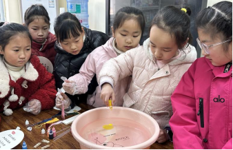 活动现场,老师首先介绍了漆扇文化和“漂漆”的原理:利用漆不溶于水的特质,以点、甩、弹、划等手法,在水面绘出图案效果。随后,孩子们挑选喜欢的漆色,依次滴入水中,用木棒轻轻点拨,看着色彩在水面流动、交融,形成变幻莫测的纹路。
