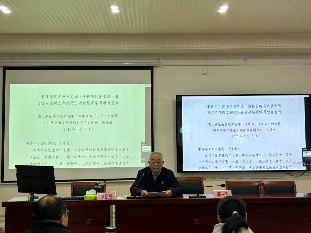 3月16日上午,2026年度大通区中青年干部培训班暨学习贯彻党的二十届四中全会精神轮训班在区委党校开班,区委常委、组织部长茆永生同志出席开班式。来自区直机关、区法院、区检察院以及乡镇(街道)等单位的35名学员参加了开班式。此次培训班学制一个月,课程设置上包含习近平新时代中国特色社会主义思想、党性教育、履职能力、马克思主义基本理论、树立和践行正确政绩观学习教育五个单元。中共淮南市委组织部原常务副部长张强胜同志受邀为学员讲授题为《中青年干部要争当忠诚干净担当的高素质干部 自觉走在树立和践行正确政绩观学习教育前列》的开学第一课。学员们纷纷表示:开学第一课高度契合本次培训班主题,紧紧围绕新时代好干部标准,既有理论深度,又有实践温度,为年青干部加强党性修养、提升能力作风指明了方向。