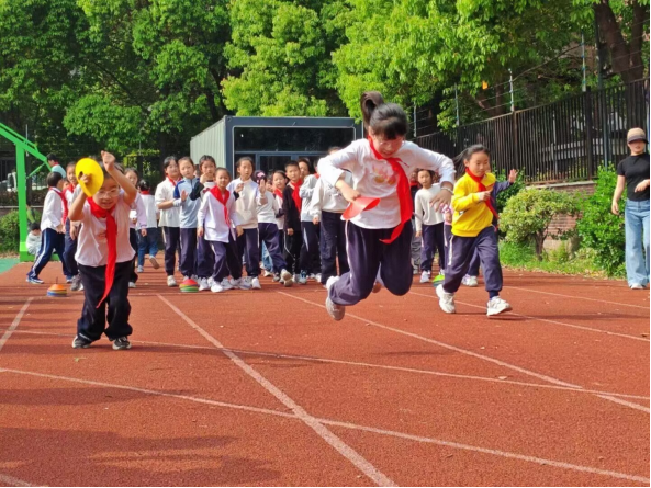中年级比赛融合仰卧、跳跃等体测动作,重点考验团队接力与策略配合。学生需分工协作、信任队友、精准传递。每一次成功传盘都伴随着欢呼,每一次失误则换来“没关系,再来一次”的鼓励。德育在真实的互动中落地:学会倾听、学会包容、学会为集体荣誉而克制自我。