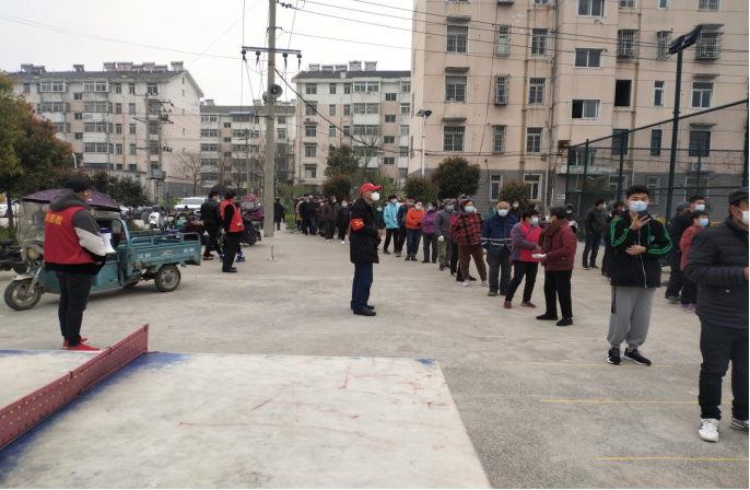(图为纪检干部在维持群众按照间隔一米距离排队。)