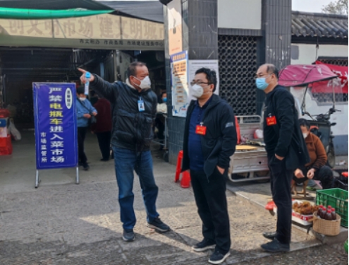 图为大通区纪委监委工作人员到上窑镇菜市场督查疫情防控情况。