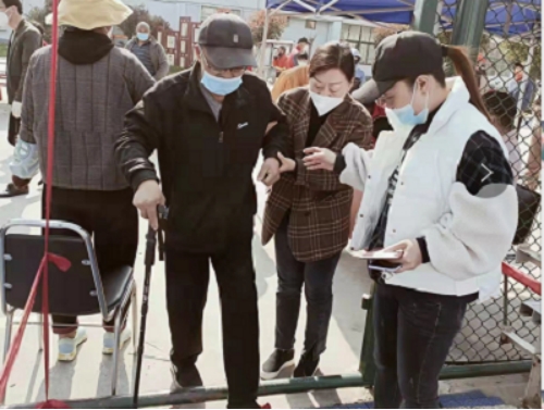 图为大通区纪委监委工作人员帮助行动不便的老同志前往核酸检测点。