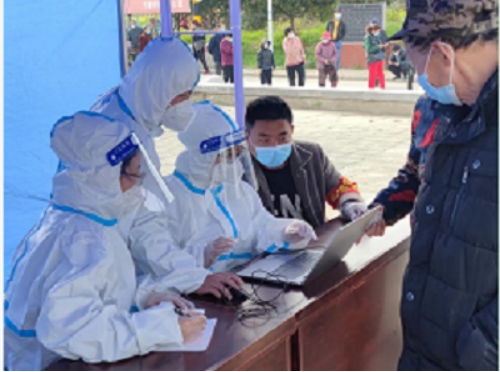 图为大通区纪委监委工作人员化身“大白”,协助村委会做核酸检测登记。