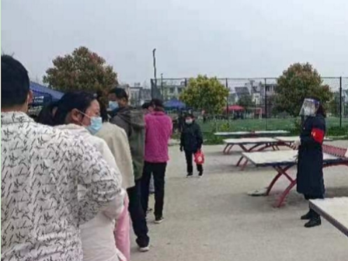 图为大通区纪委监委工作人员在夏菜村核酸检测采样点劝导村民有序排队。