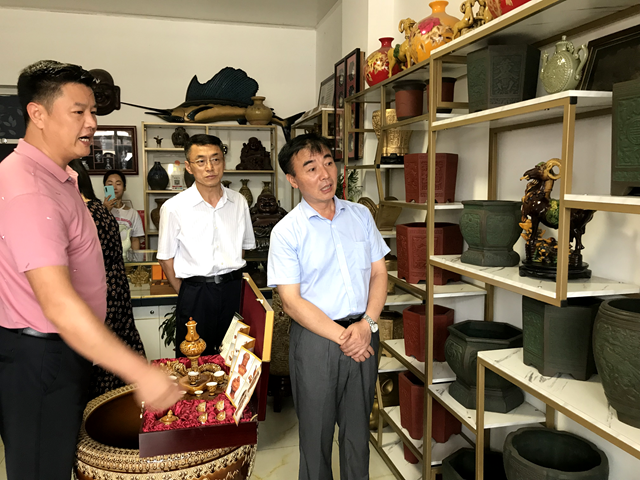 在寿州窑陶瓷研究所,明冠雷饶有兴致地欣赏了各具特色、精美绝伦的紫砂、陶瓷艺术品,深入了解了寿州窑紫砂、陶瓷的悠久历史、原材料开采使用、传统作品继承和创新、技艺人才保护和培育等相关情况,并对寿州窑陶瓷研究取得的成绩给予充分的肯定。他指出,寿州窑陶瓷研究所的建立,方便我们更加直观的了解古寿州窑的“前世今生”。相关部门要加大支持力度,坚持保护优先理念,不断探索寿州窑遗址保护、文化传承和有效利用新途径、新方法。要加强非遗人才培养和传统文化传承力度,推动寿州窑紫砂、陶瓷产业持续、健康发展。要发挥好文化和旅游融合发展的机制优势,促进文旅融合高质量发展。