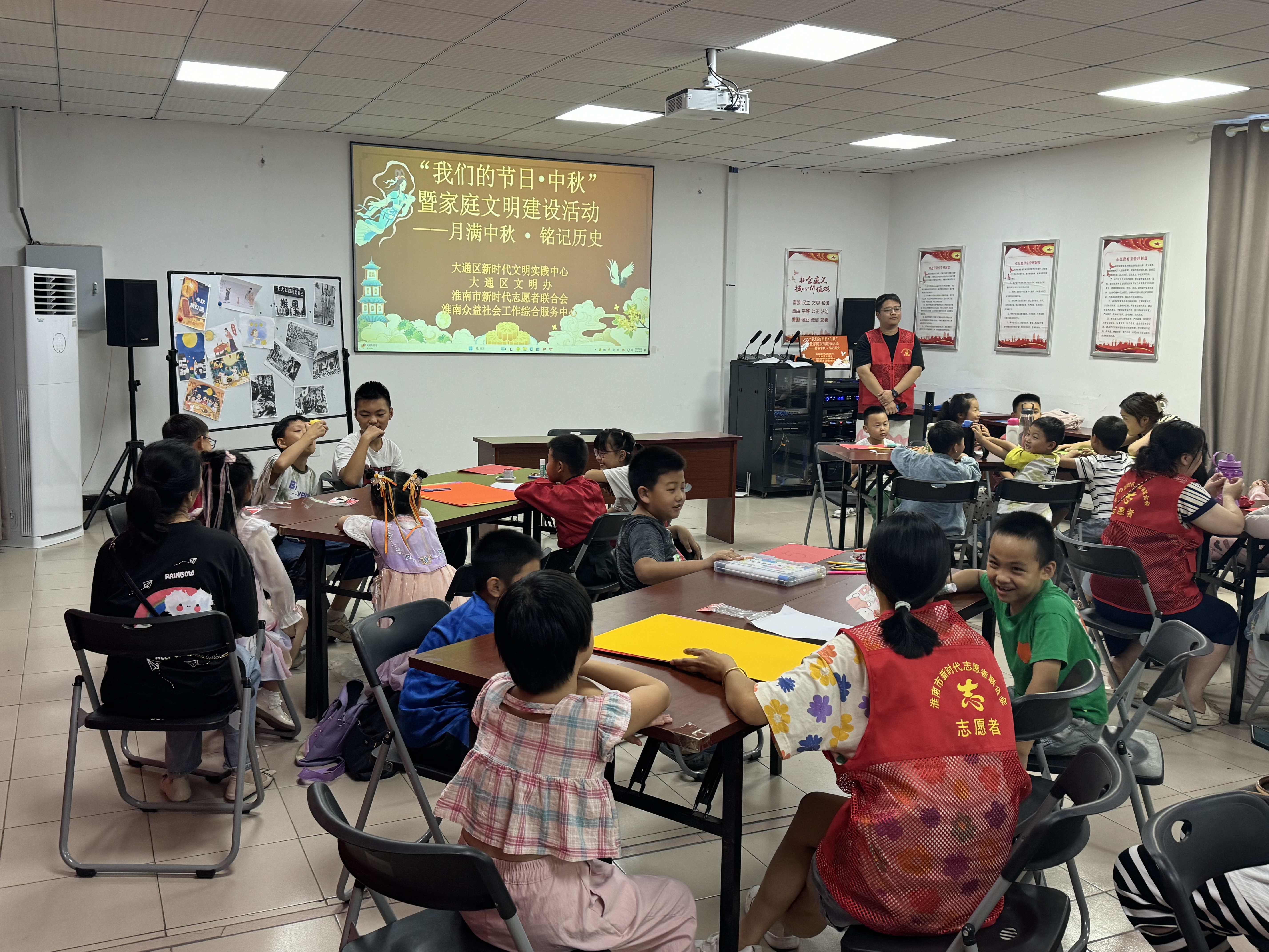 9月15日下午,在中秋佳节和9·18事变纪念日来临之际,大通区文明办联合淮南市新时代志愿者联合会、淮南众益社工在区新时代文明实践中心开展“我们的节日•中秋”-月满中秋 铭记历史主题活动,辖区内25位青少年参加此次活动。
