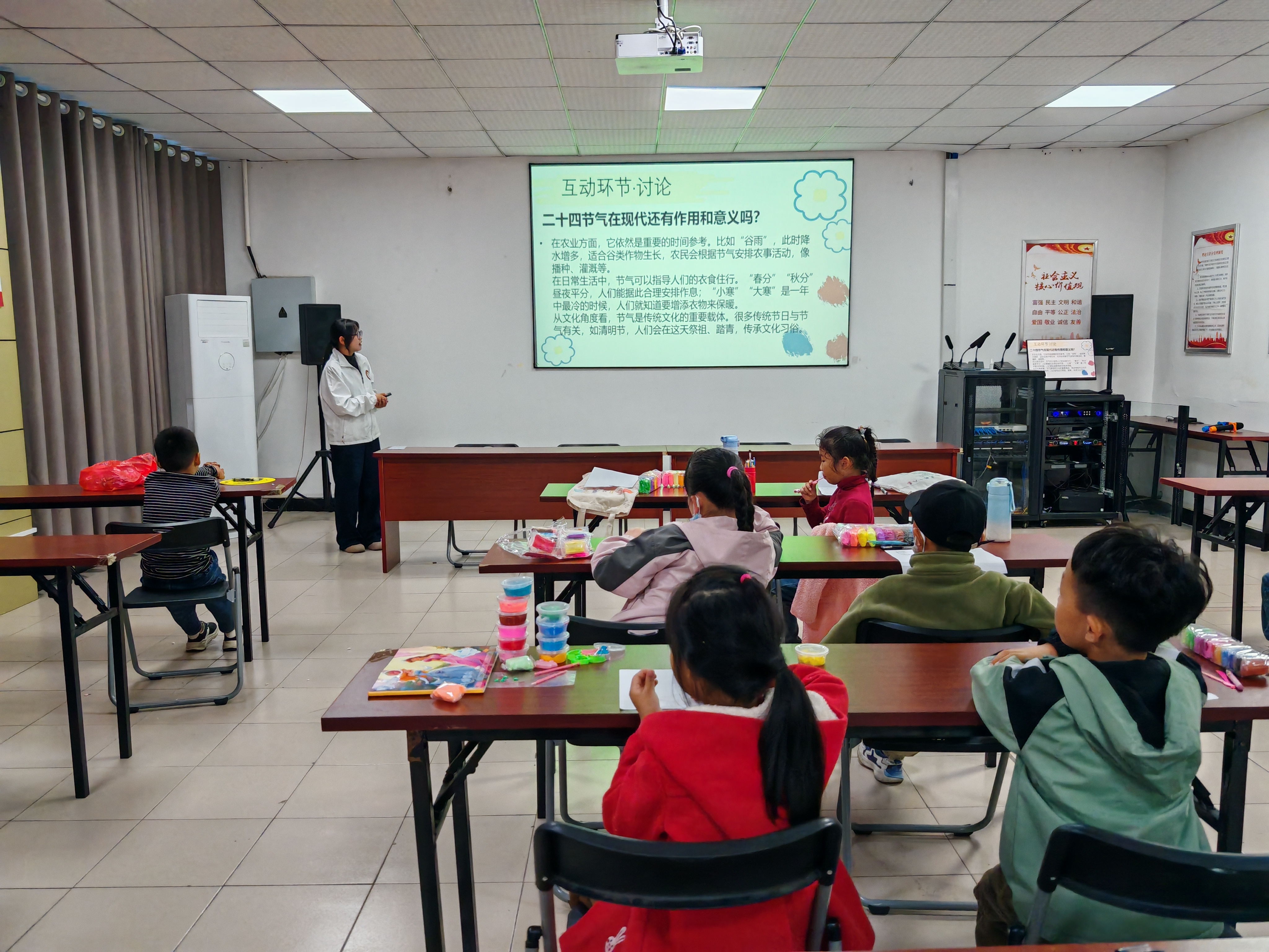 当天,活动在《二十四节气歌》的欢乐气氛中开始,志愿者首先带领孩子们朗读了《二十四节气歌》,简单介绍二十四节气中每个字代表的节气,接着通过PPT图文并茂地讲述二十四节气的起源与发展、各个节气所对应的季节与大致时间,详细介绍了部分节气对应的自然现象与习俗。同时志愿者结合全国消防安全宣传教育日强调各个节气的自然气候及民俗活动可能引起的消防隐患及注意事项,普及火灾预防、火灾自救等消防知识。最后进行知识问答,展示不同节气所对应的图片,提问孩子们节气名字、自然现象、民俗活动等,引导孩子们互动讨论二十四节气对于现在生活的影响与作用。