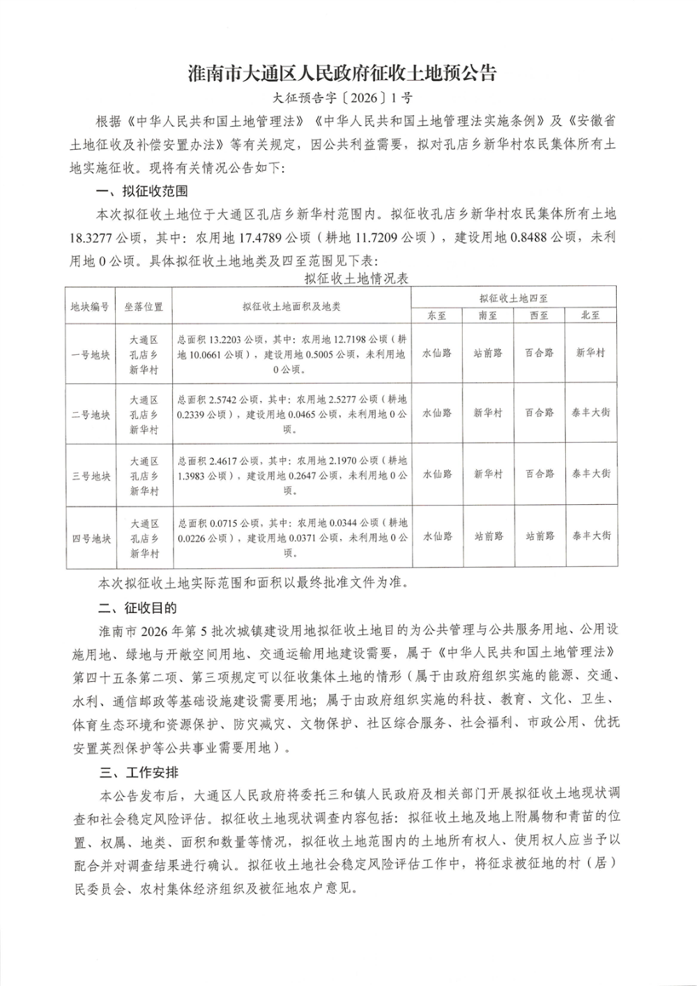 淮南市大通区人民政府征收土地预公告
